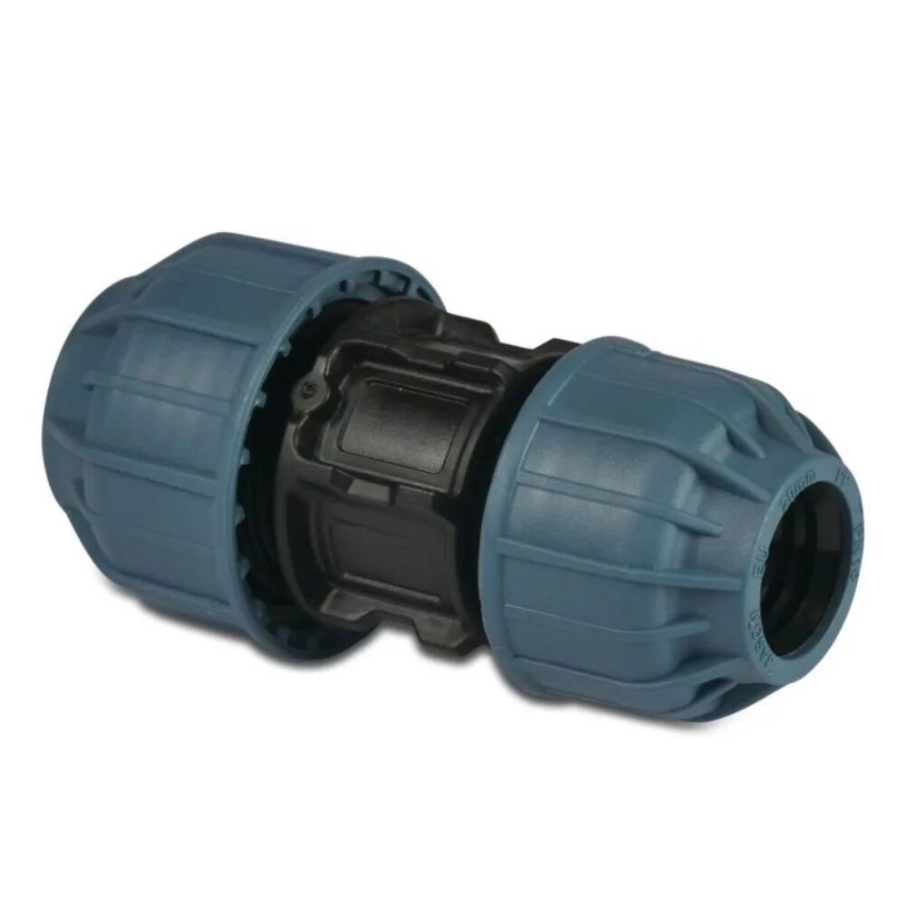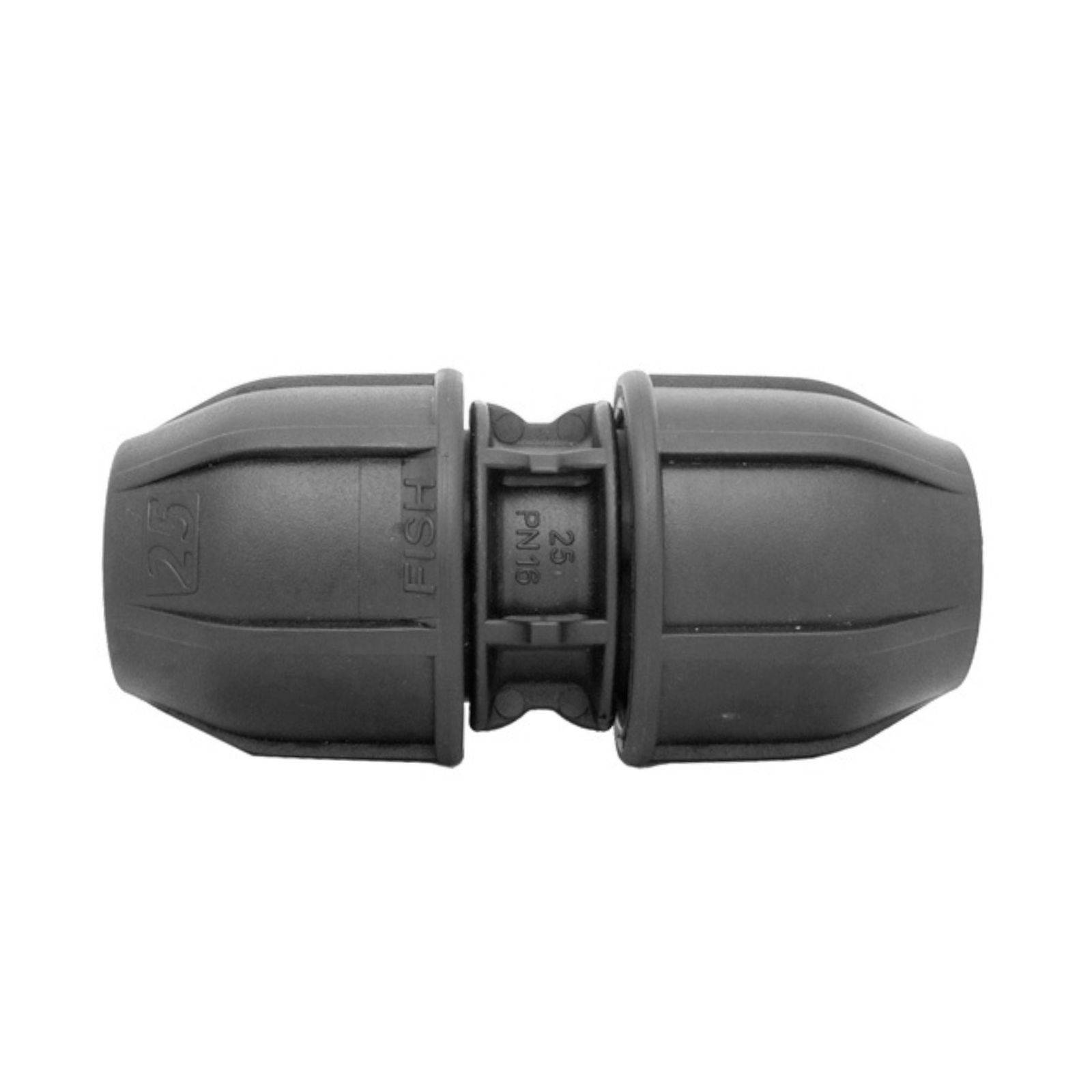 Dwuzłącze 50-50 PE Fish od producenta Fish to wytrzymała złączka prosta wykonana z polipropylenu, idealna do łączenia rur PE o średnicy 50 mm. Dzięki wytrzymałości na ciśnienie do 16 bar, zapewnia niezawodne połączenia w systemach nawadniania ogrodów.