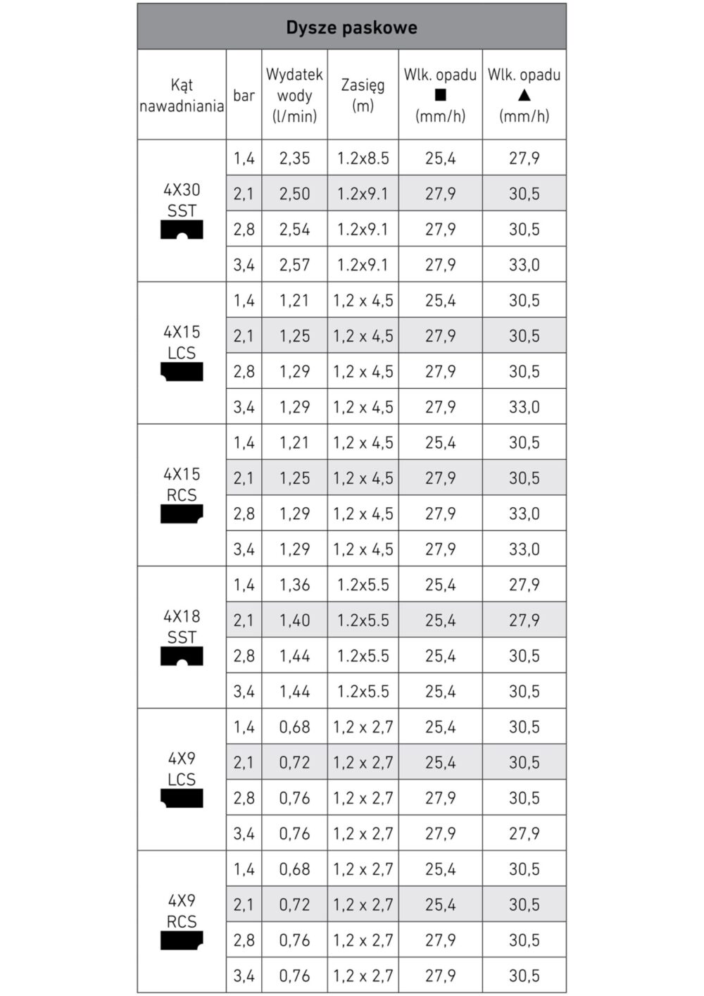 - Dostosowana wielkość opadu = 14 mm/godz. (0,55″/godz.) Dysze dostarczają wodę wolniej i bardziej równomiernie niż standardowe dysze do zraszania. Wielkość opadu wynosząca 14 mm/godz. (0,55”/godz.) pozwala zapobiec przekraczaniu czasu pracy w systemie wyznaczonym przez okna blokowaniu się dyszy.