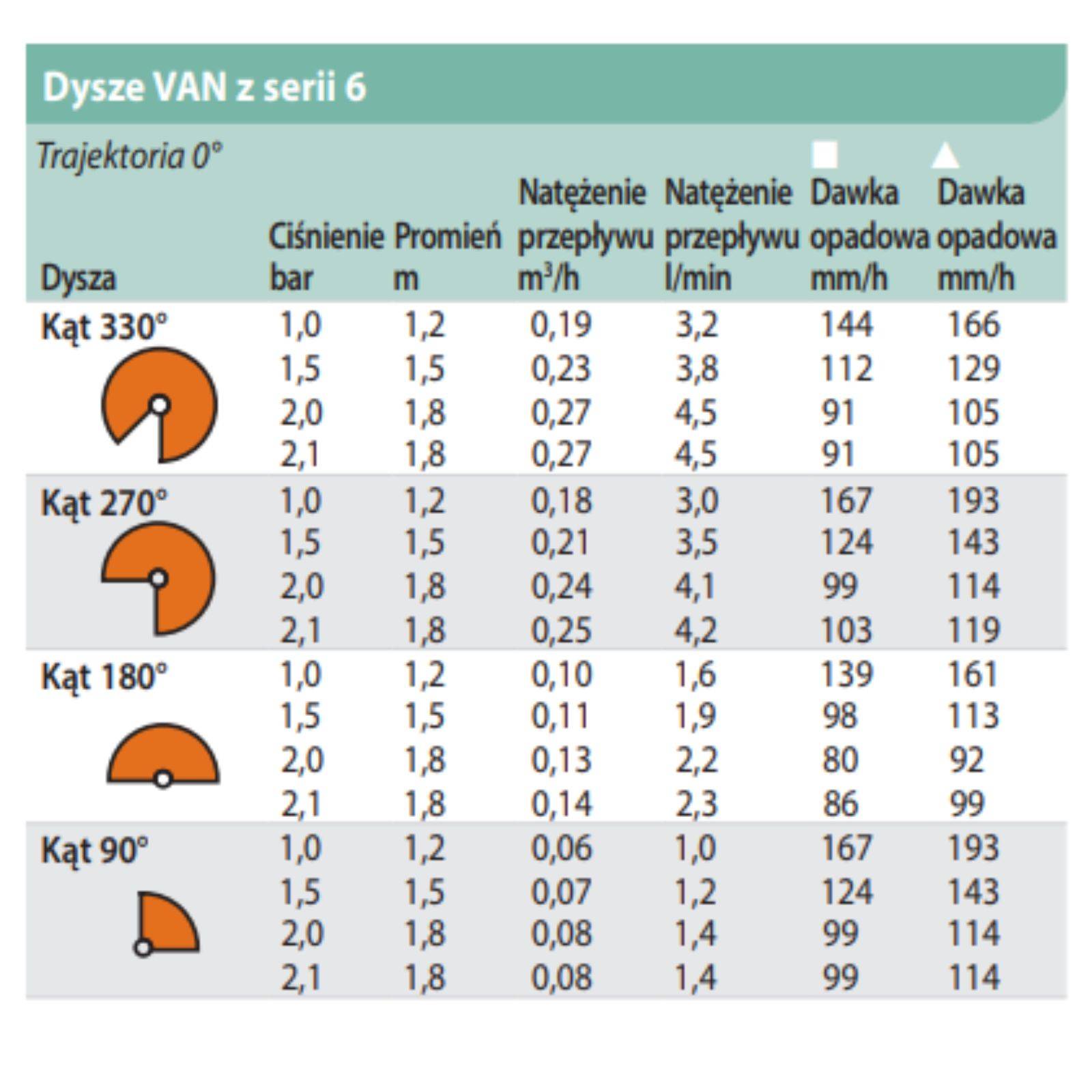 W jednej sekcji warto stosować dysze o podobnym opadzie. Mniejsze modele, takie jak 4-VAN i 6-VAN, zwykle najlepiej pracują w sekcjach zbudowanych głównie z dysz VAN o różnym zasięgu. Dzięki temu cała sekcja jest łatwiejsza do ustawienia na sterowniku i przewidywalna podczas podlewania.