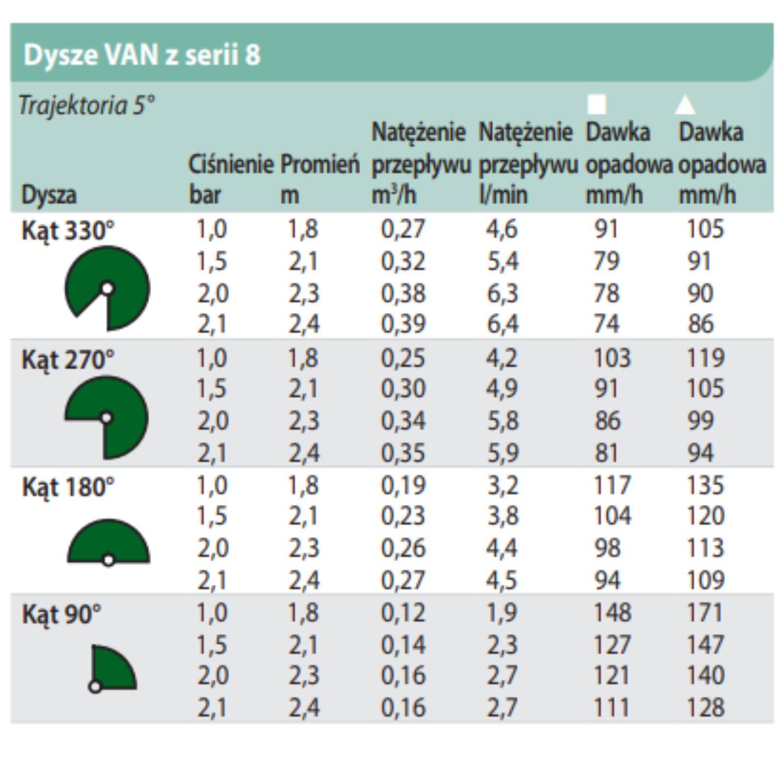 - planujesz sekcję opartą głównie na dyszach z rodziny VAN, bez mieszania ich z dyszami rotacyjnymi.