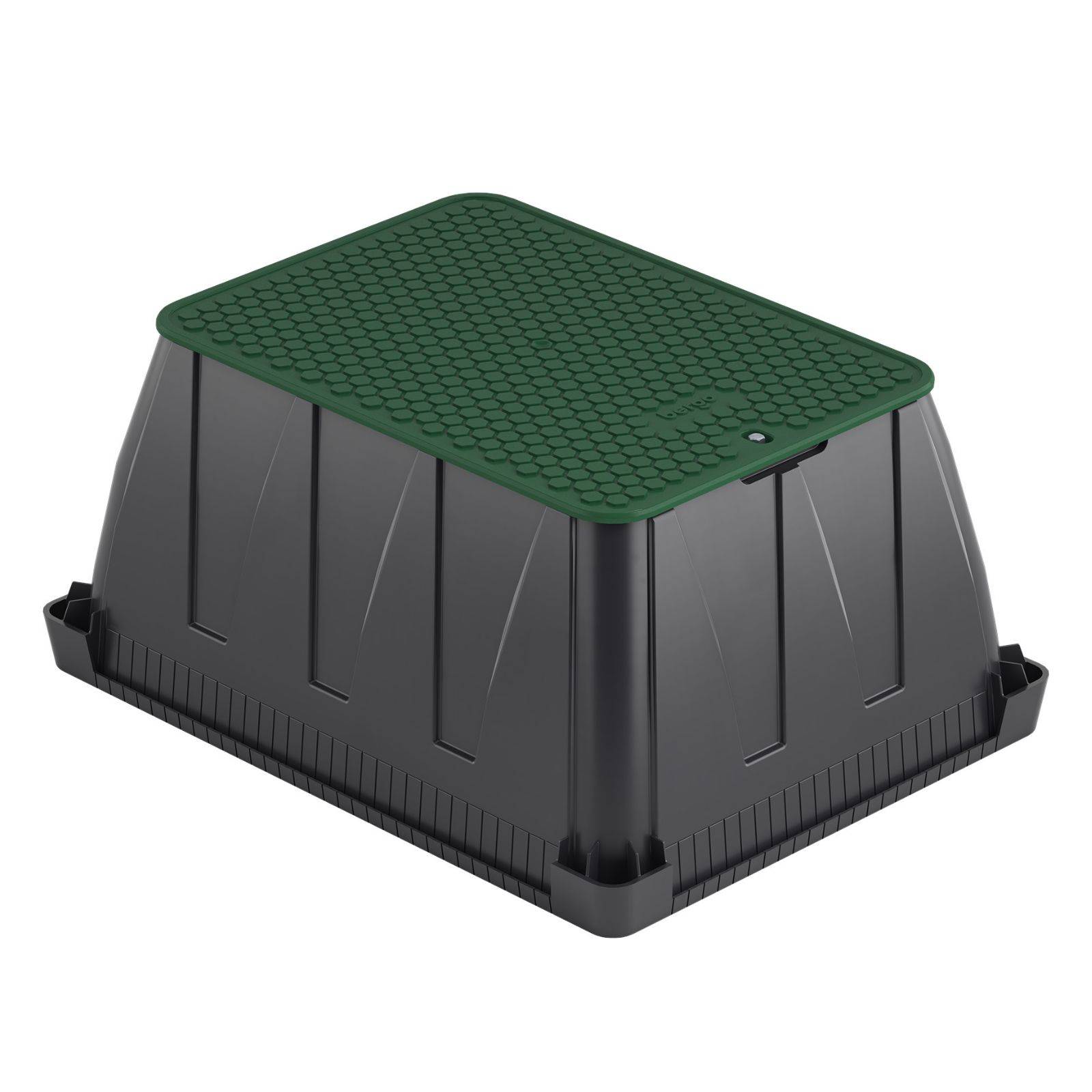 Duża skrzynka bez dna do zakopania w ziemi, przeznaczona do elektrozaworów w automatycznych systemach nawadniania. Model Jumbo mieści swobodnie do 6 elektrozaworów, dlatego ułatwia montaż, rozbudowę i późniejszy serwis instalacji.