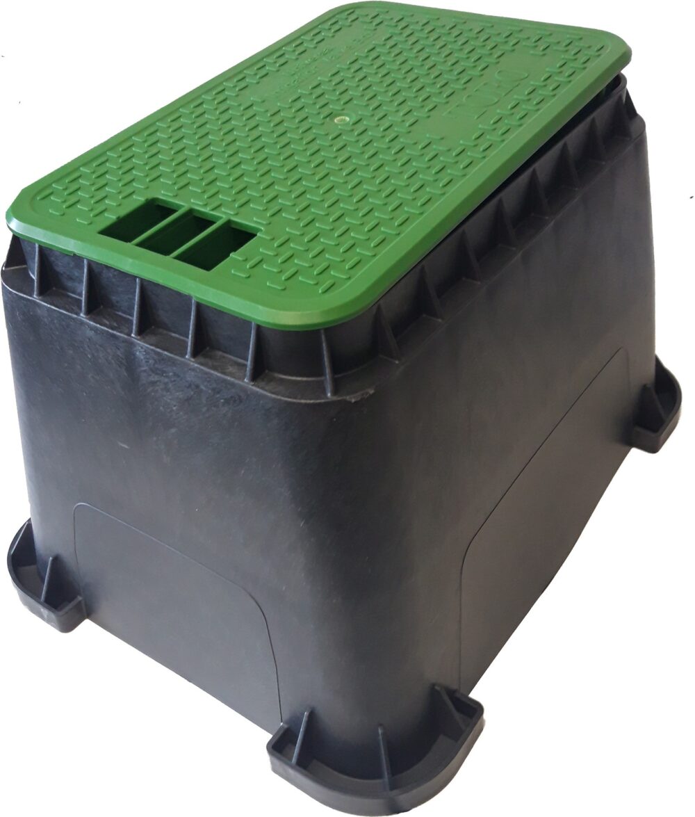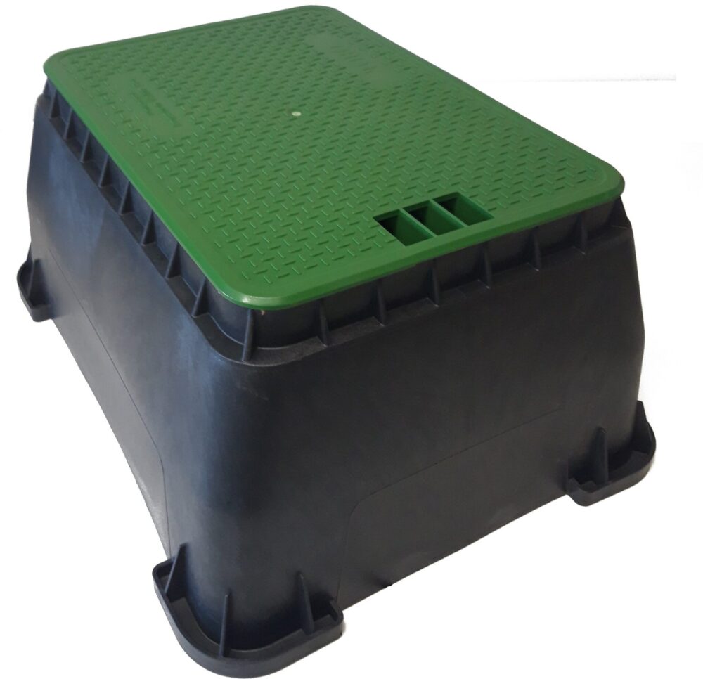 Skrzynka zaworowa large na 6 elektrozaworów. Posiada śrubę która chroni przed przypadkowym otwarciem. Wykonana z tworzywa sztucznego. Gwarantuje szybki dostęp do zaworów i innych urządzeń. Studzienkę zaleca się montować w miejscu dostępnym i sprzyjającym prowadzenie późniejszych prac konserwatorskich oraz nie zakłócającym estetyki. Skrzynka posiada gotowe otwory doprowadzające rury do elektrozaworów.
