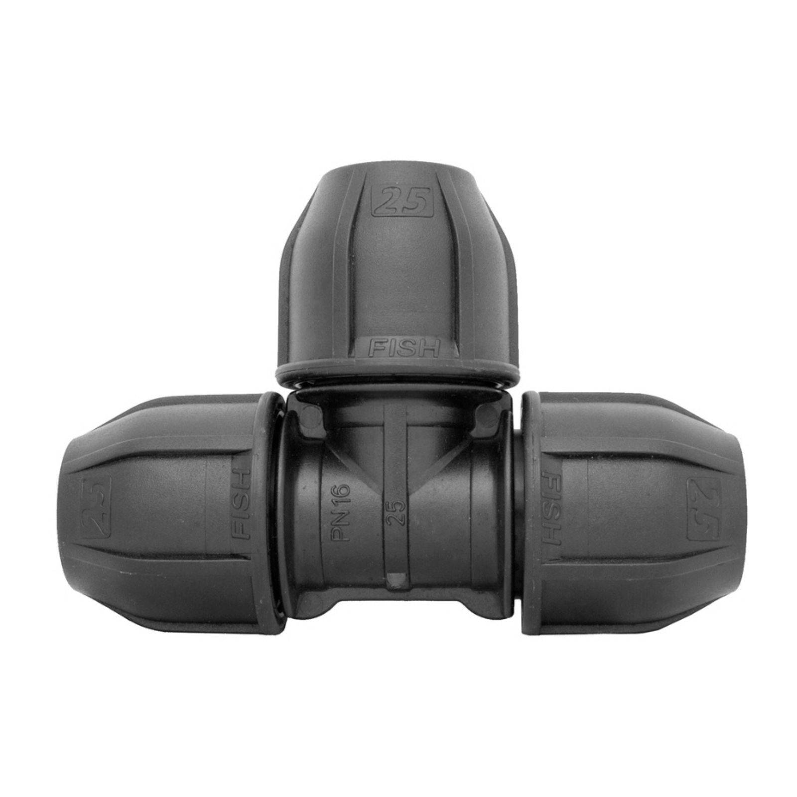 Trójnik PE 50mm-50mm-50mm od producenta Fish to wytrzymała złączka prosta wykonana z polipropylenu, idealna do łączenia rur PE o średnicy 50 mm pod kątem 90°. Dzięki wytrzymałości na ciśnienie do 16 bar, zapewnia niezawodne połączenia w systemach nawadniania ogrodów.