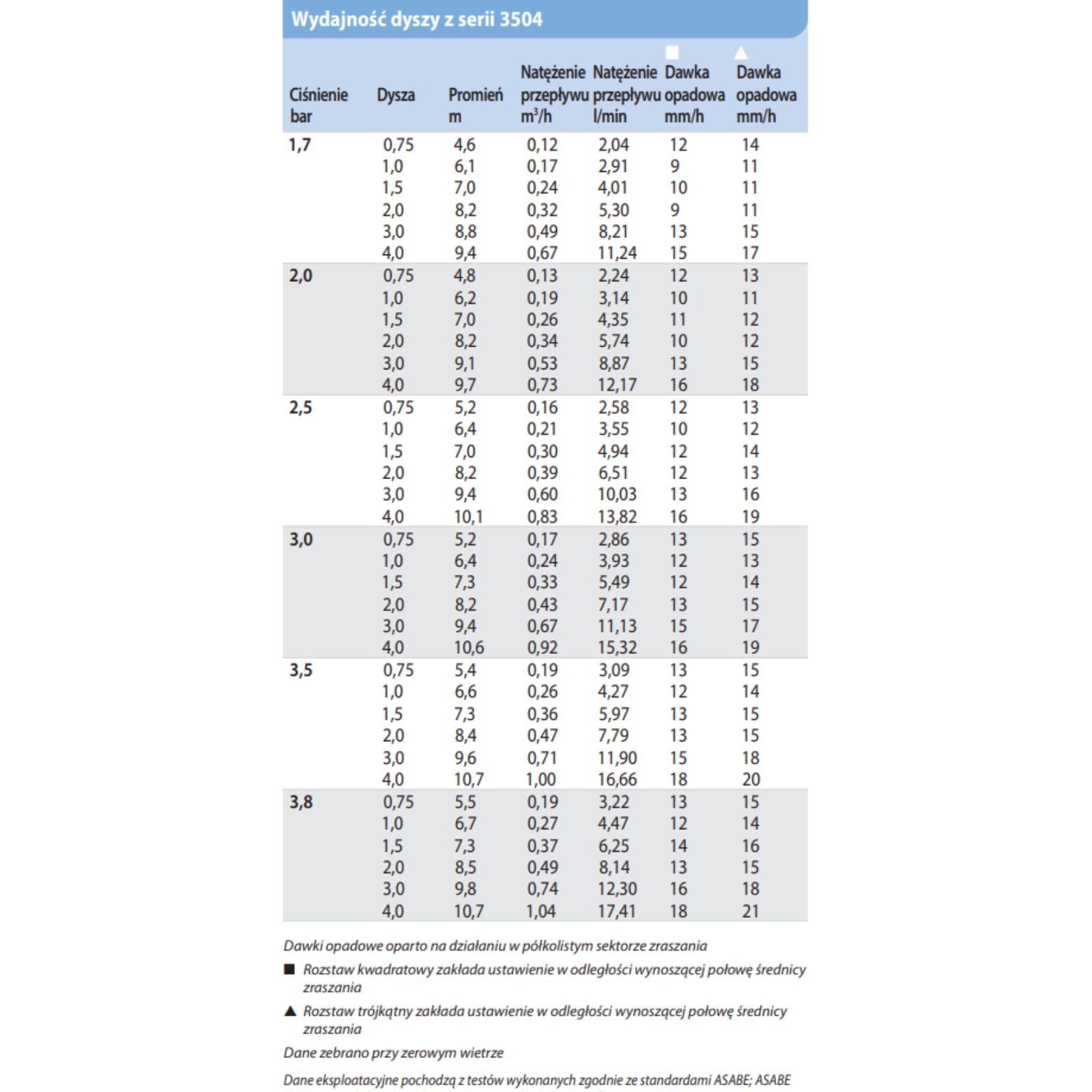 Parametry te zależą od zastosowanej dyszy i rzeczywistego ciśnienia, dlatego każdy użytkownik może dopasować zraszacz do wielkości swojej sekcji.